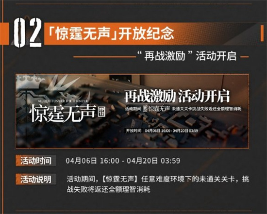 活动说明:活动期间,玩家在【惊霾无声】中任意难度下的未通过关卡,挑战失败将会返还全部的理智。