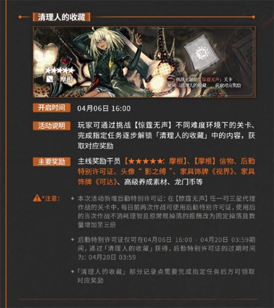 2、后勤特别许可证仅可在04月06日 16:00 - 04月20日 03:59期间,通过「清理人的收藏」获得,后勤特别许可证的过期时间为:04月20日 03:59