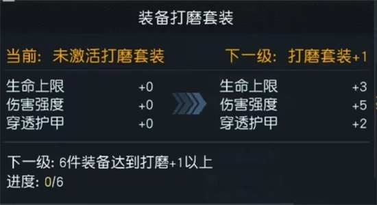 值得一提的是,打磨系统另有套装效果,当一套装备抵达肯定的等级后便可激活,除了优等打磨以外,每三级都会激活新的打磨套装效果,打磨套装效果有额外的生命上限、伤害强度优等穿透护甲数值加成。