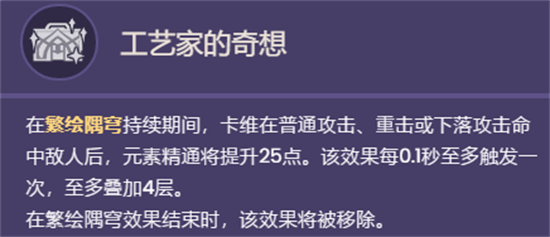 在繁绘隅穹持续期间,卡维在普通攻击、重击或下落攻击命中敌人后,元素精通将提升25点。该效果每0.1秒至多触发一次,至多叠加4层。