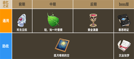 ①通用证:开局带死生泣祝,解锁核心后换轻,如一叶菩提,后期再换成黄金酒盏,后面boss层可带3星戒律章善恶明证。
