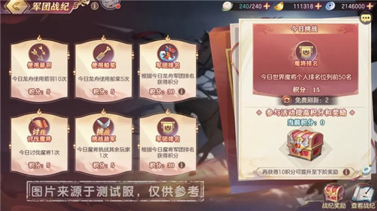 每天5:00会重置并刷新出6个普通任务和1个挑战任务,普通任务固定不可刷新,挑战任务可以刷新并随机替换为其他任务。达成任务要求即可获取对应积分,提高积分以提升评级以及每日奖励。不同积分档位对应不同数量的元宝、军团每日补给包奖励。