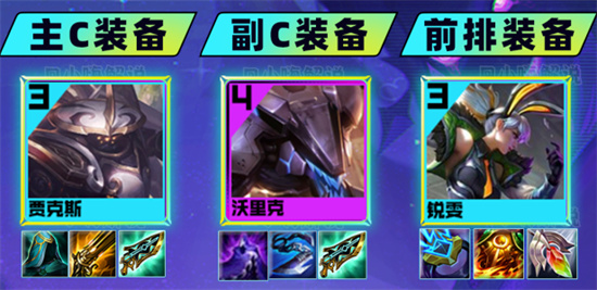 8人口开出6斗士3战斗机甲即可成型,后期追3星贾克斯>锐雯,锐雯后期一定要3星,这是我们主要的坦度。装备方面尽可能多拿一些基克的先驱给贾克斯打启动。