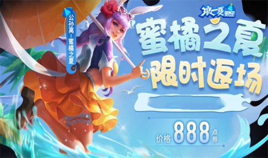 2、而且在这次的夏日盛典中还会返厂公孙离-蜜橘之夏皮肤,价格为888点券即可秒杀。