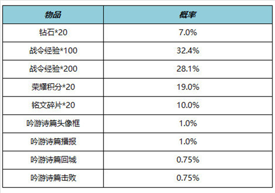 打开可随机获得以下奖励之一:吟游诗篇头像框、吟游诗篇播报、吟游诗篇回城、吟游诗篇击败、荣耀积分*20、100/200战令经验、钻石*20、铭文碎片*20。