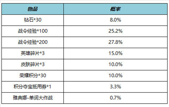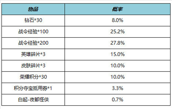 打开可随机获得以下奖励之一:白起-夜都怪侠、积分夺宝抵用券*1、英雄碎片*3、皮肤碎片*3、荣耀积分*30、100/200战令经验、钻石*30。