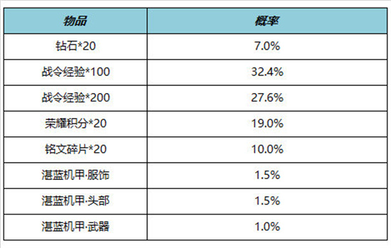 打开可随机获得以下奖励之一:湛蓝机甲·头部、湛蓝机甲·服饰、湛蓝机甲·武器、荣耀积分*20、100/200战令经验、钻石*20、铭文碎片*20。