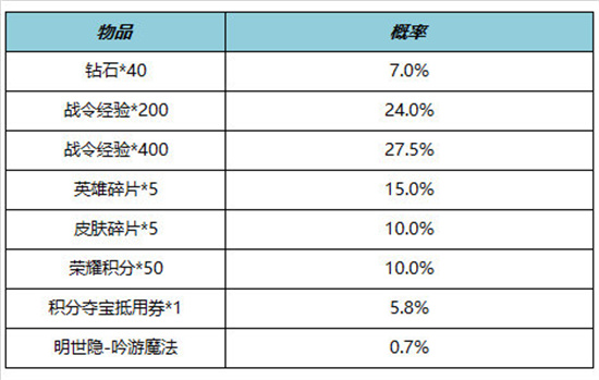 打开可随机获得以下奖励之一:明世隐-吟游魔法、积分夺宝抵用券*1、英雄碎片*5、皮肤碎片*5、荣耀积分*50、200/400战令经验、钻石*40。