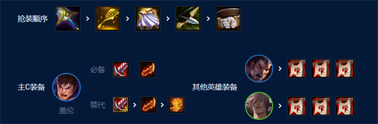 盖伦必备饮血羊刀,第三件靠德玛西亚羁绊偷光明装备,然后棋子越多越好,后期要做一个轻语给后排帮盖伦破甲迅速过前排