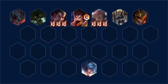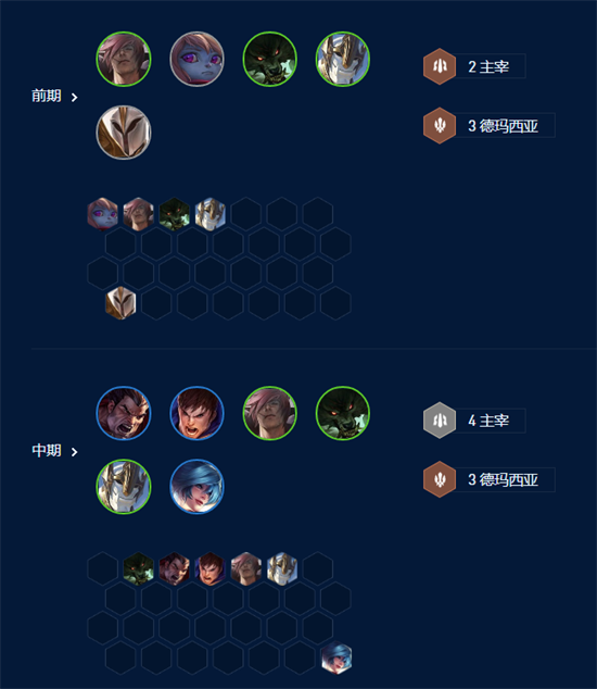 主宰前排一字排开分摊伤害,盖伦吃最多的棋子站中间,琴女带轻语帮盖伦破甲,后期也可以对位盖伦和对面后排C位站同侧,尽量快速切到后排