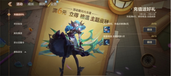 玩家需要充值满6元来参与活动,并且完成一系列的任务活动才可以解锁格温主题皮肤(具体的皮肤详情将以上线为准)。