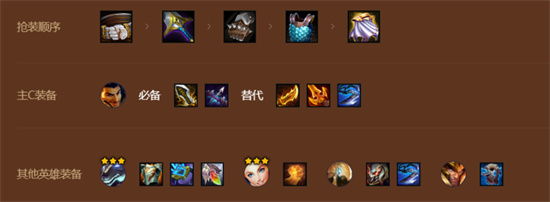 装备先和肉装保前期连胜,然后考虑阿克尚的装备,其次是拉克丝的法强装和皇子的冰甲,沙皇捡破烂即可。