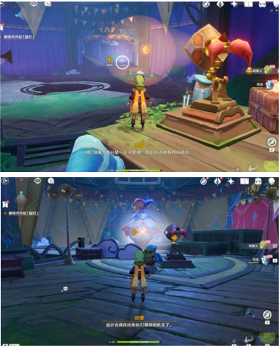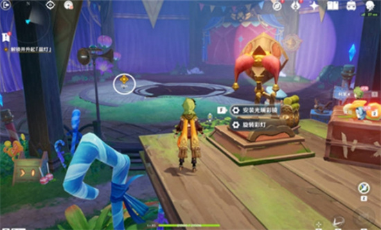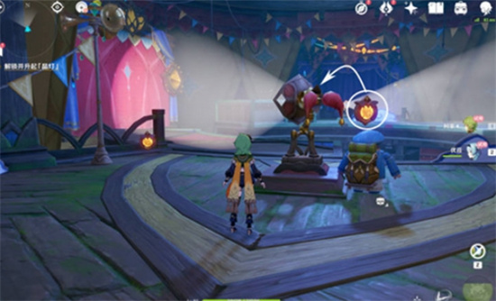 5、帷幕升起就能开启宝箱,顺着楼梯上去继续旋转彩灯,接着走到对面,再旋转一次彩灯。
