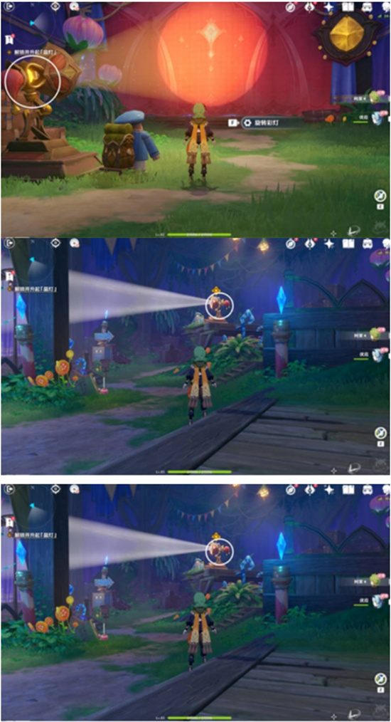 9、借助先成图来到对面,放置彩镜并旋转彩灯,就能完成全部的解谜,返回完成后续对话结束该任务。
