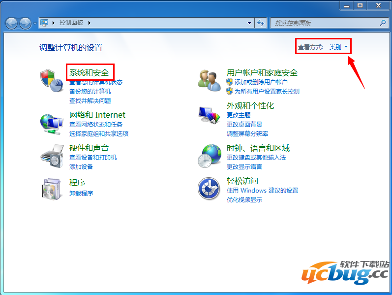 2)打开控制面板后,右上角选择到类别,再选择系统和安全。
