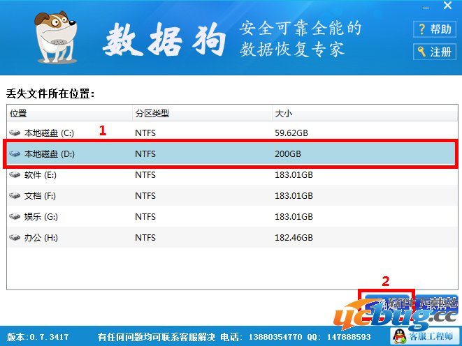 第二步:在区域1内选中被格式化的磁盘,点击区域2的确定键,进入数据恢复进度条。