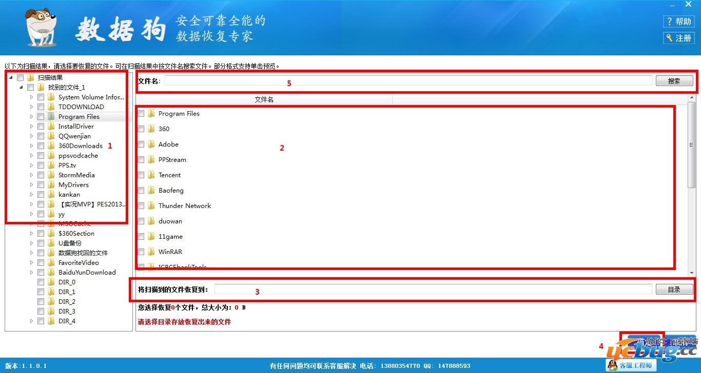 第四步:待扫描完成后,软件自动进入“恢复文件选择界面”,如下图所示。如果您想要恢复移动硬盘里的所有资料,那么请在区域1内的菜单栏中选中所有文件夹;如果您只需要恢复移动硬盘里的部分资料,您可以在区域1内选中您需要恢复的文件原存放的文件夹,然后再区域2内找到并选中您需要恢复的文件,您也可以尝试使用区域5内的搜索功能,直接将您需要的文件显示在区域2内。找到您需要的文件后,单击文件名还可以对文件进行预览。接着,在区域3内选择文件恢复后的保存路径,为保证恢复成功,请勿将恢复数据的保存位置设置为您格式化的移动硬盘。完成上述步骤后点击区域5内的确定。