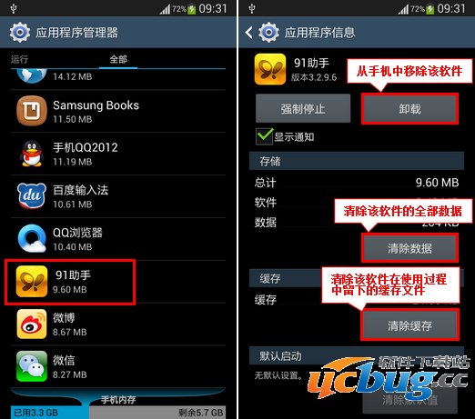 5.选中您想要优化的应用程序(这里以“91助手”为例)。进入后,您可以直接选择“卸载”、“清除数据”、或“清除缓存”,来进行优化,从而来释放您的机身内存(部分应用不可删除)。
