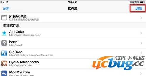 如何添加呢?打开 Cydia ,点底下“软件源”,再点编辑,然后左上角就会在软件源列列表,如下图所示,点右上角的编辑,然后左侧的刷新就会变成添加,然后再点添加,就会出现一个地址栏,键入:"http://apt.so/aptso" 搜索,然后Cydia会自动添加“刀八木”源。