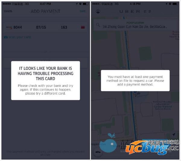 一小时绞尽脑汁的尝试之后,转战支付宝,还是失败了。而且,如右图所示,没有关联银行卡或者支付宝的Uber是不能打车的,Uber移动APP高冷的写着,请先添加一种支付方式。而国内打车软件在这方面就显得好用很多,现金、银行卡、钱包和支付宝多种支付方式,轻松便捷。