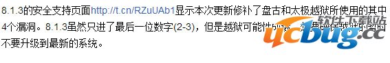 来自越狱界的消息表示,本次更新修复了太极越狱当中所用到的四个漏洞,虽然iOS 8.1.3只进行了最后一个数字的更新,但是显然你还想要越的话,请不要更新。