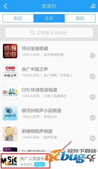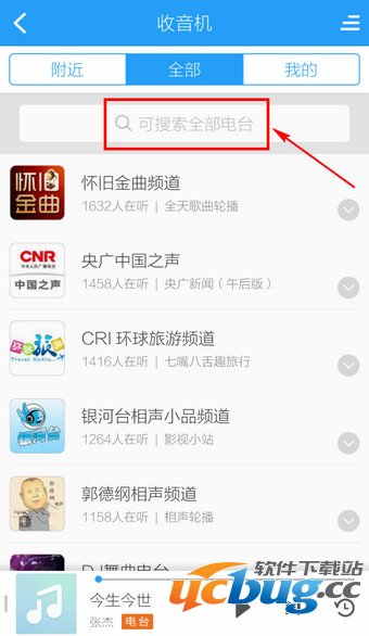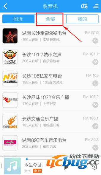 2.进入电台默认是显示【附近】,如果要搜索的话,点击【全部】