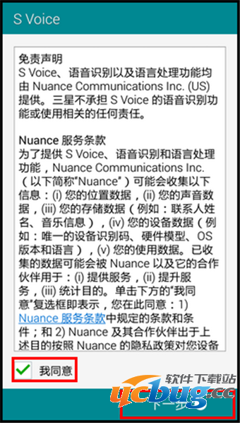 4.阅读S Voice免责声明后,勾选【我同意】,然后点击【下一步】。