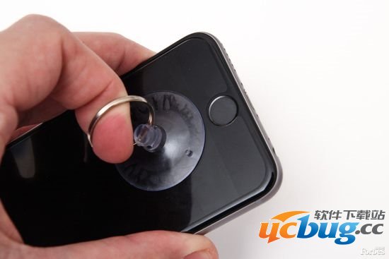 第4步:使用吸盘在主页键(Home)上方拉出屏幕。把吸盘固定在主页键的正上方,另一只手握住机身,然后往外拉。你只需要在屏幕和机身之间撬开足以塞进一个塑料片的空间。