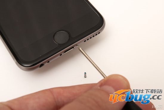 第3步:关掉手机电源,使用工具包里的五角形螺丝刀拧下螺丝。螺丝刀的头部很小,但它跟 iPhone 6底部的小螺丝是匹配的。