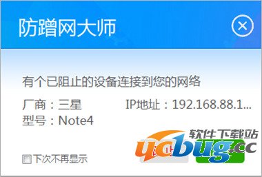 防蹭网大师有一个比较人情化的设计,就是有新的设备连到你的WIFI,它会跳出一个窗口,提醒一下你。小编测试发现,新的设备和被阻止的设备上线,防蹭网大师都会提示,新设备肯定是需要提醒的,但是已经阻止的设备也提醒,有点讨厌。后来小编发现,新设备的提示和已阻止设备的提示不一样,已阻止设备的提示框左下角有一个“下次不再显示”的框框,有木有?请看下面的截屏
