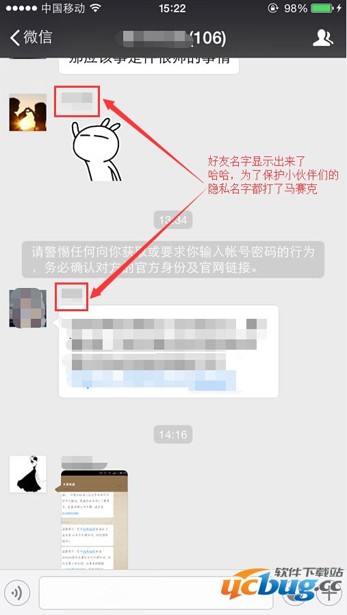 3、返回群聊天界面,看看每条聊天记录上面是不是都显示出好友姓名了?