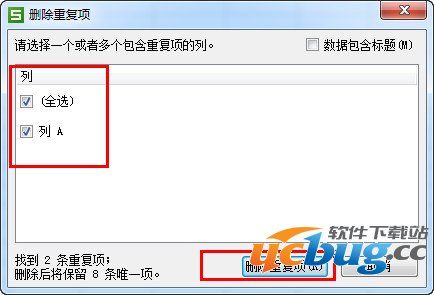 4、点击“重复项”在下拉列表中找到“删除重复项”——打开“删除重复项”复选框,在复选框中你可以设置查找重复项的范围:比如我这里是点击了“全选。——最后点击“删除重复项”就OK了。