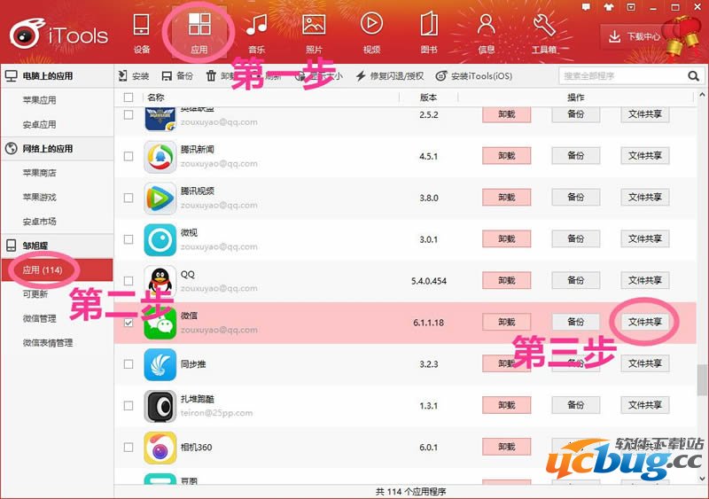 2.在电脑上连接手机,打开iTools 选择 应用-应用-文件共享。