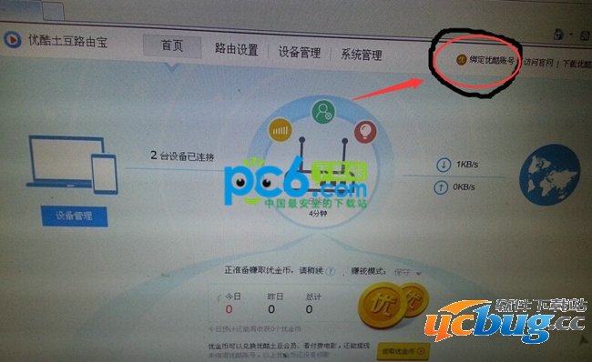 里面不简单啊,包括首页路由器的基本使用情况,路由设置,设备管理,系统管理,还有绑定优酷账号,官网链接,非常之详细,与以前的路由器设置界面完全不同,这个分类明朗,操作更便捷。既然有钱赚,那么我们先别忙于进入分类设置,还是先绑定优酷账号吧