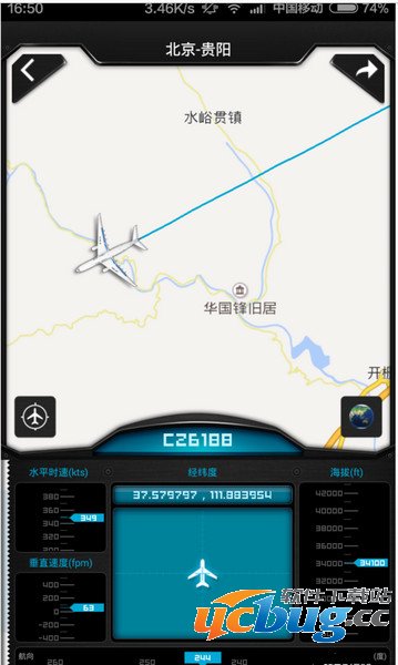 5、接下来,我们就会看到该航班的详细情况,包括飞机的路径,经纬度,速度等详细信息。当然还有我们熟知的查询航班的功能,小伙伴们赶快试试吧。