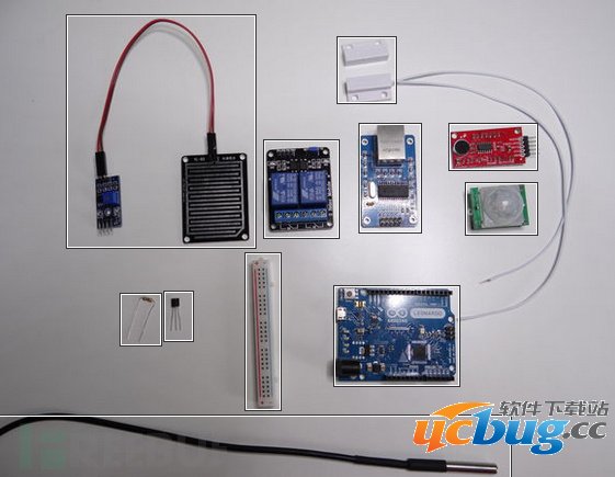 Arduino、以太网模块ENC28J60、2*DS18B20温度传感器、麦克风模块、雨滴传感器、红外传感器、簧片开关、继电器、4/7千欧姆的电阻器、双绞线、网线、焊接工具、螺丝刀