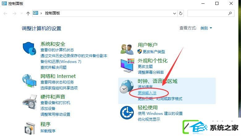 3、在打开的“控制面板”对话窗口中,找到“时钟、语言和区域”下的“更换输入法”选项并点击它。如图所示: